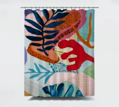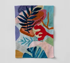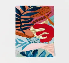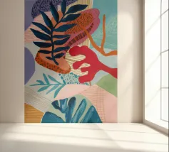 Una composizione astratta costruita con forme stratificate che suggeriscono foglie e motivi tessili, in una sofisticata tavolozza di blu, terracotta, beige, bianco e un sottile accenno di rosso.