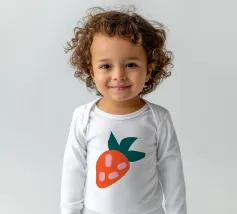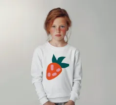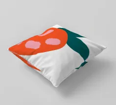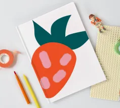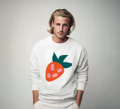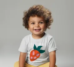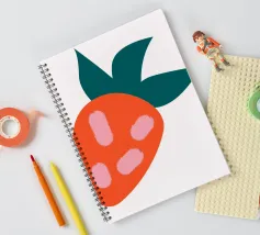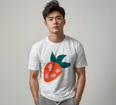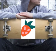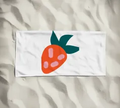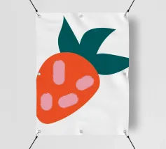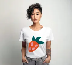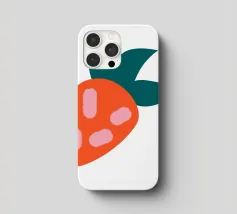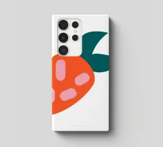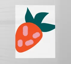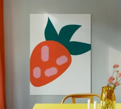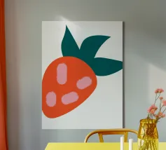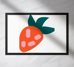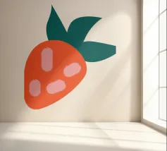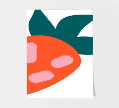La rappresentazione stilizzata e semplicistica di una fragola presenta un corpo arancione con tre semi rosa e foglie verde scuro. Il design minimalista utilizza colori e forme audaci per evocare un'atmosfera giocosa e moderna.