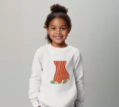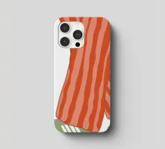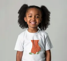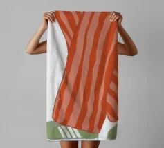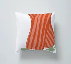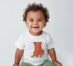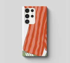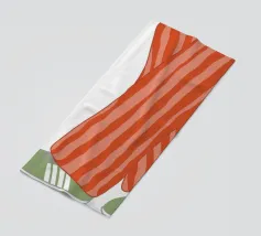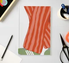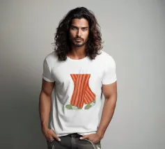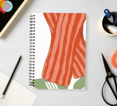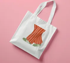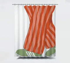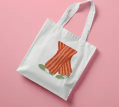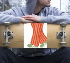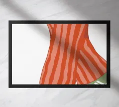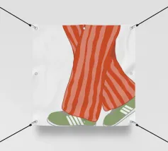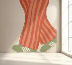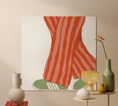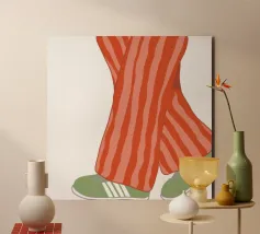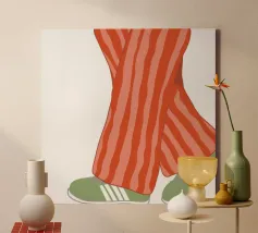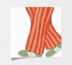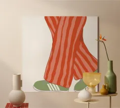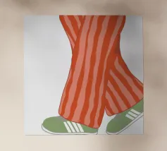 Un'illustrazione ravvicinata, ad angolo basso, delle gambe di una persona che indossa pantaloni a gamba larga a righe arancioni e sandali verdi. La composizione è un'istantanea trendy, retrò ed elegante della moda moderna.