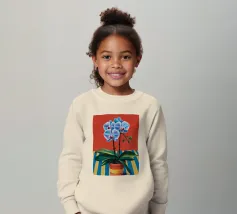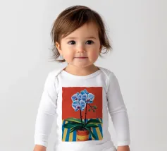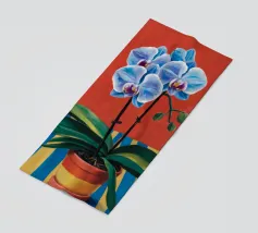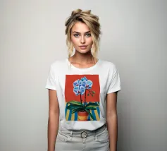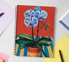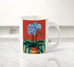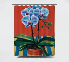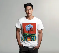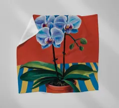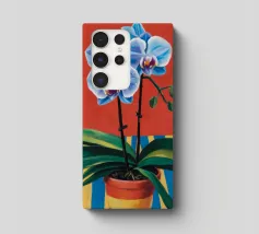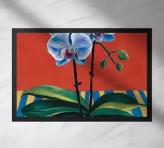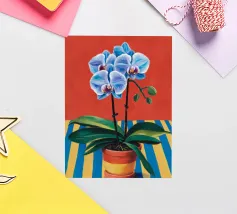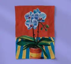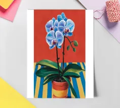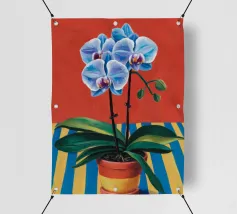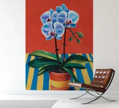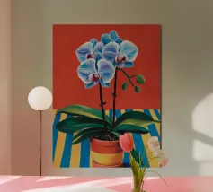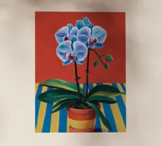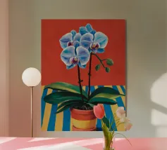 Un'elegante orchidea blu in vaso su uno sfondo a strisce rosse e arancioni. La composizione è una straordinaria combinazione di bellezza naturale e design grafico, che crea una dichiarazione moderna e sofisticata.