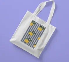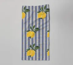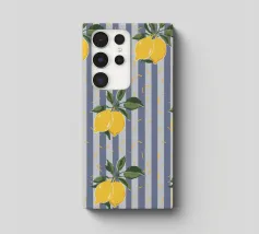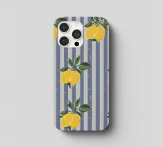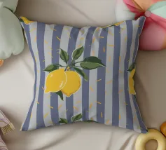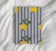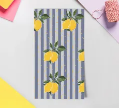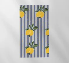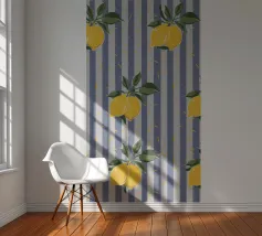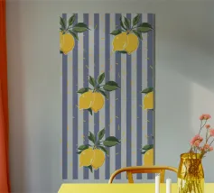 Una bella natura morta di un ramo di limoni in un vaso, su uno sfondo a strisce verticali bianche e blu. La composizione è fresca e classica, con un'atmosfera mediterranea e pulita.