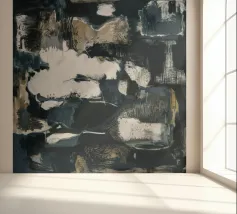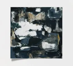 Un'opera astratta altamente strutturata, dominata da neri, carboncini e grigi, con un impasto visibile o una pittura stratificata che suggerisce la consistenza ruvida e duratura della pietra o dei muri antichi. Stile Melissa Herrington.