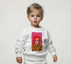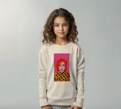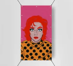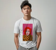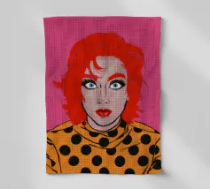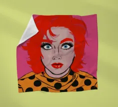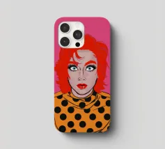 Un sorprendente ritratto pop art di una donna dagli occhi spalancati, con capelli rossi e camicia leopardata, che cattura un momento di shock o di stupore su uno sfondo rosa.