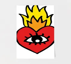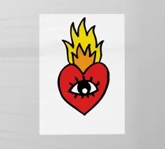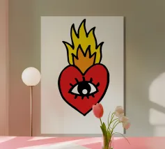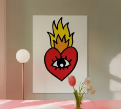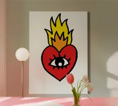 Un cuore rosso stilizzato presenta un occhio al centro, sormontato da vivaci fiamme gialle e arancioni. I contorni neri e decisi aggiungono un contrasto sorprendente all'immaginario simbolico e fiammeggiante.
