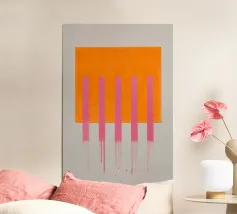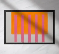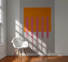 L'arancione brillante incontra il rosa sfumato: quest'opera astratta combina chiarezza geometrica e sfocatura controllata. Cinque strisce verticali sembrano fuoriuscire dal blocco arancione, come il calore, l'energia o l'emozione. L'opera appare controllata e impulsiva allo stesso tempo, ideale per ambienti moderni caratterizzati da forza, dinamismo e colore.