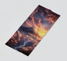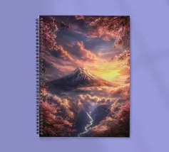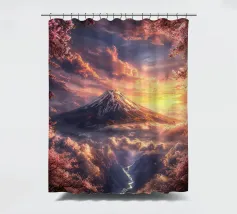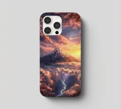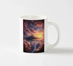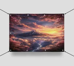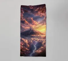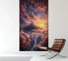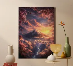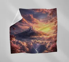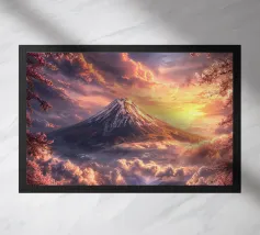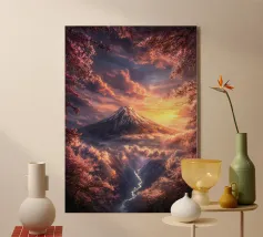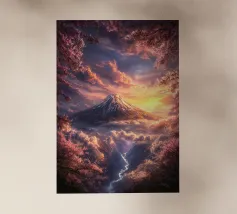 I fiori di ciliegio incorniciano la cima del Fuji mentre il sole tramonta in oro fuso. Le nuvole rotolano come onde sulla valle, un fiume di luce che si snoda attraverso la terra: un sogno dell'eterna primavera giapponese.