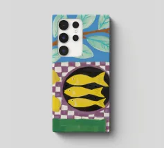 Una stravagante natura morta con tre pesci gialli con motivi neri appesi a un ramo su uno sfondo a scacchiera, sotto un cielo blu brillante.