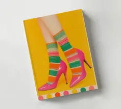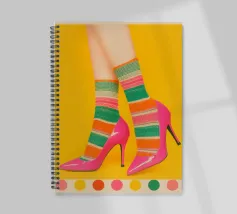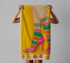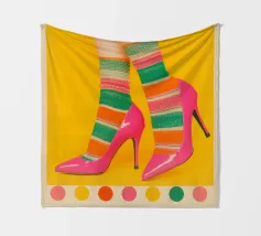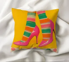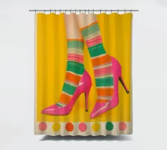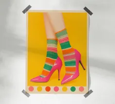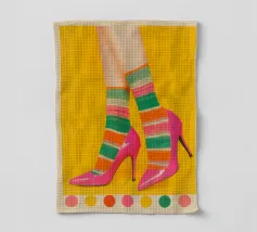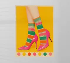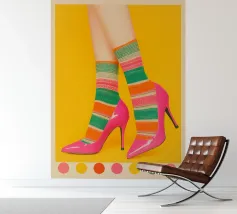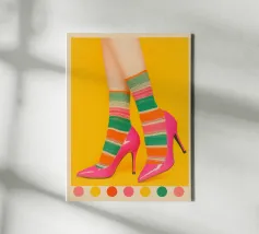 Quest'opera d'arte colorata presenta tacchi alti rosa abbinati a pois colorati e calzini a righe che incarnano un moderno look retrò degli anni 70-80. Lo sfondo giallo brillante e i colori vivaci evidenziano perfettamente la moda giocosa: una dichiarazione per ogni casa attenta alle tendenze.
