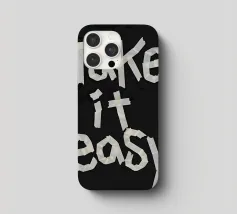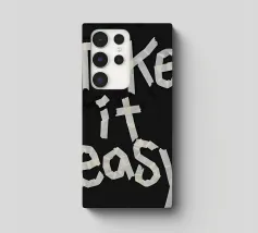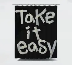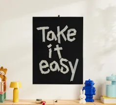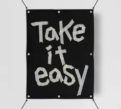 "La frase 'Take it easy' è scritta con strisce di nastro adesivo su uno sfondo nero pieno, creando un'atmosfera informale e artigianale.