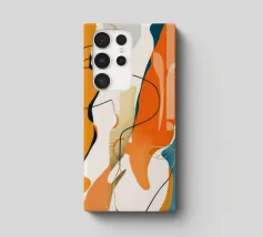 Figure curve arancioni, verde acqua e crema danzano con accenti neri in un'improvvisazione ritmica.