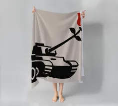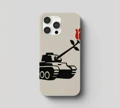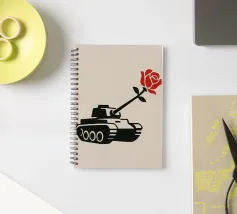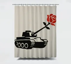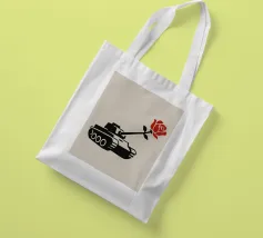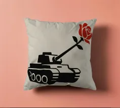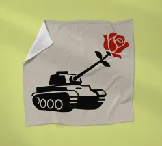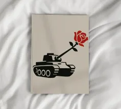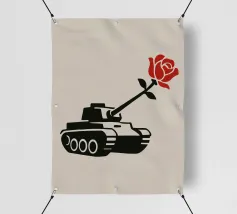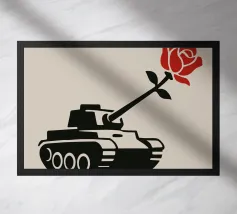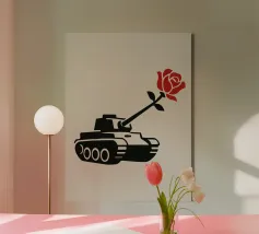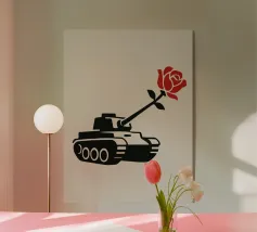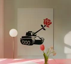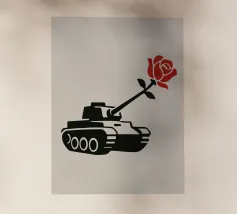 La silhouette nera di un carro armato è raffigurata con una rosa rossa che emerge dalla canna del cannone. Il contrasto tra la macchina da guerra e il delicato fiore simboleggia la pace che prevale sul conflitto.