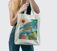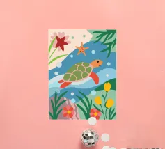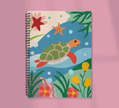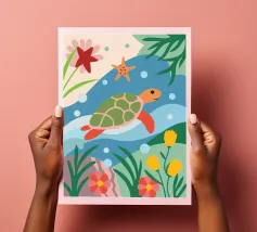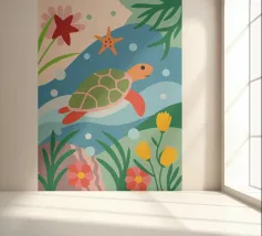 L'illustrazione dettagliata presenta una graziosa tartaruga che nuota tra una vivace barriera corallina.
