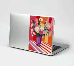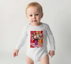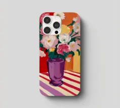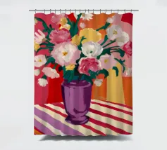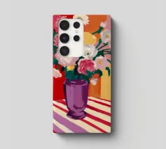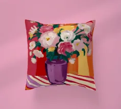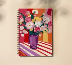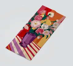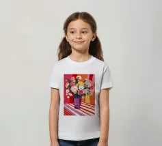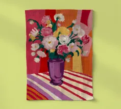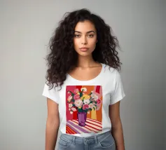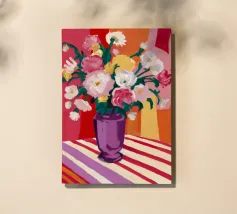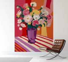 Un radioso bouquet di fiori bianchi e gialli in un vaso viola, adagiato su un tavolo con un'audace stoffa a righe. Lo sfondo rosso brillante fa risplendere l'intera scena di una luce calda, gioiosa ed energica.