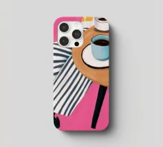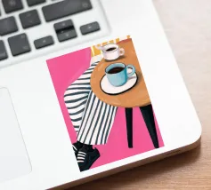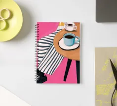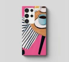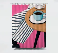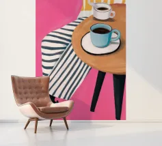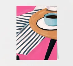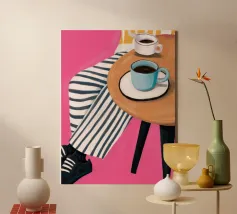 Due tazze di caffè si trovano su un tavolino rotondo con una tovaglia a righe bianche e rosa, visto dall'alto. La composizione cattura il piacere semplice ed estetico di una pausa caffè condivisa.