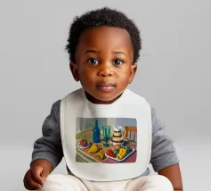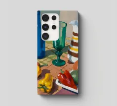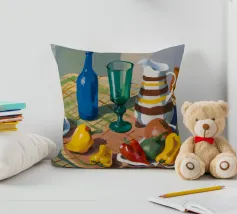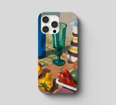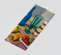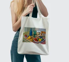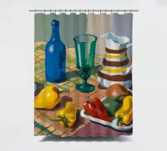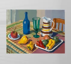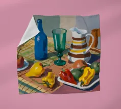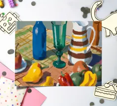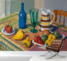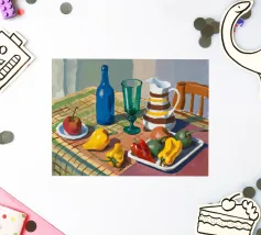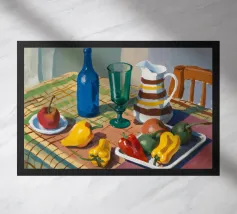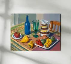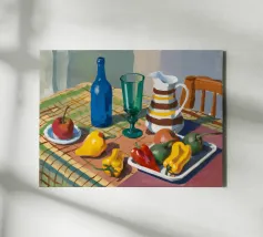 Una natura morta rustica di un tavolo da pranzo carico di frutta, una brocca a motivi, una bottiglia blu e bicchieri. La prospettiva angolata e i colori ricchi evocano una classica scena di raccolto.