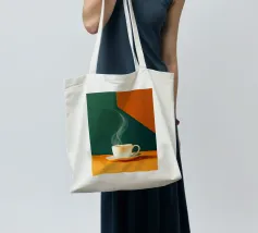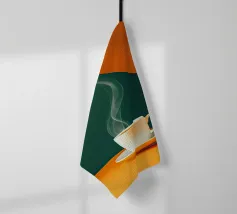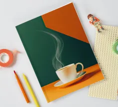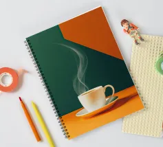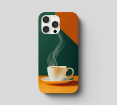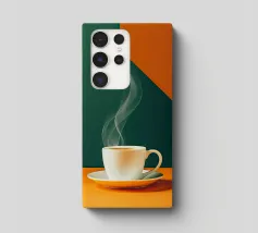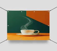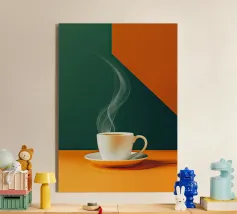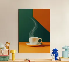 tazza di caffè caffè fumante piattino pareti bicolore parete arancione parete verde forme geometriche ambientazione interna bevanda bevanda caffè tazza in ceramica arredamento minimalista vapore superficie del tavolo design a contrasto tazze e piattini rinfresco mattutino colori caldi composizione semplice