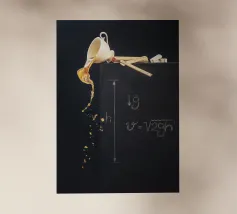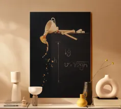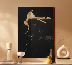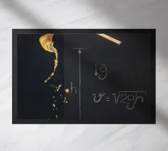 tazza da caffè versamento di liquido fuoriuscita di caffè righello lavagna disegni con il gesso formule matematiche gravità velocità righelli di legno calcolo della gravità blocchi di lettere liquido traboccante schizzo tazza appesa matematica concetto di fisica movimento del liquido lavagna strumenti di misura