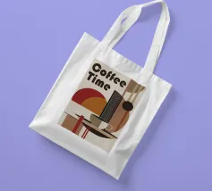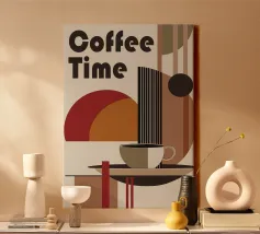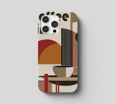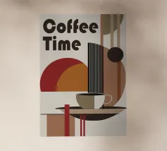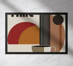 tazza da caffè piattino forme geometriche cerchi semicerchi rettangoli linee strisce caffè elementi astratti testo tipografia tema del caffè linee curve toni marroni colori beige accento rosso bordo della tazza maniglia influenza moderna di metà secolo