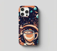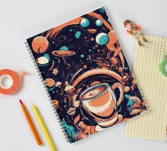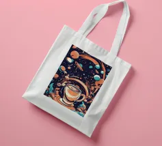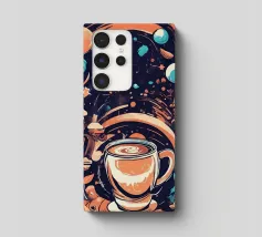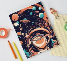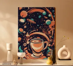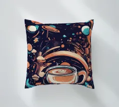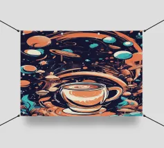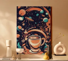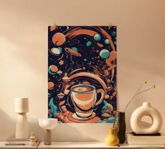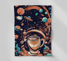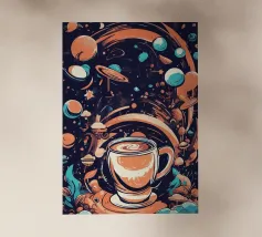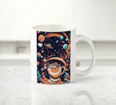 tazza di caffè pianeti saturno stelle nuvole vorticose funghi galassia spazio esterno foglie asteroidi pianeta inanellato cielo notturno caffè fantasia paesaggio surreale scena cosmica oggetti galleggianti elementi della natura corpi celesti design stravagante