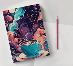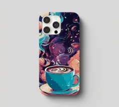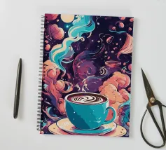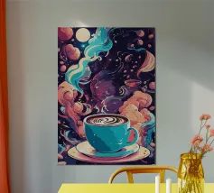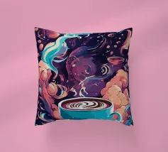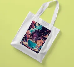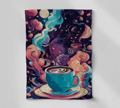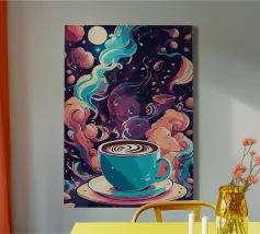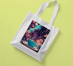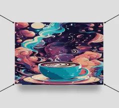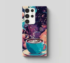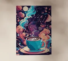 tazza da caffè cosmo turbine nuvole cielo notturno pianeti stelle galassia piattino vapore luna colori vibranti fantasia oggetti galleggianti celeste spazio stravagante surreale vortici spazio esterno