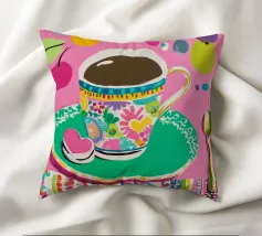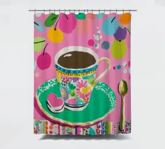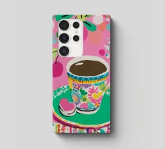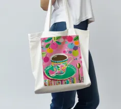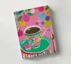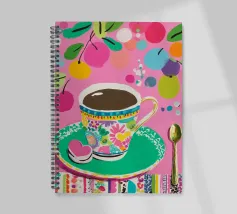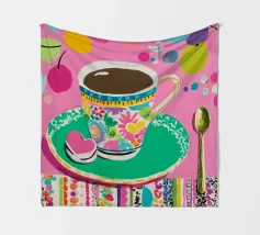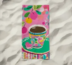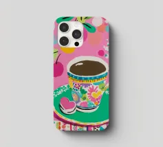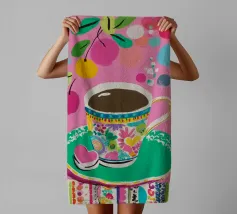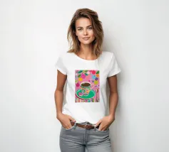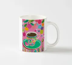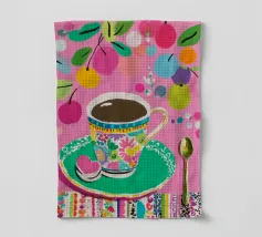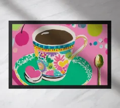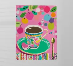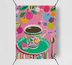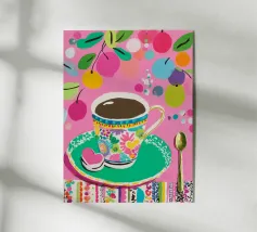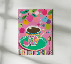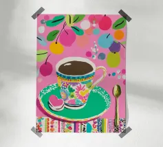 Questa vivace illustrazione combina caffè, fiori e frutta in una tavolozza di colori vivaci ed estivi. Con colori pastello tenui e un cucchiaio dorato, il motivo dell'immagine conferisce un'atmosfera allegra a qualsiasi casa, perfetta per gli amanti del caffè e della natura.