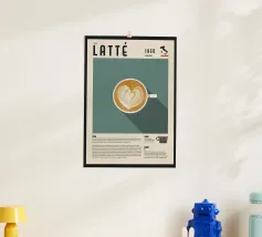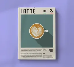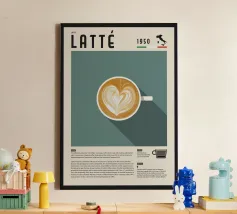 latte tazza di caffè latte art cuore testo mappa dell'Italia elenco ingredienti tipografia descrizione del caffè espresso latte crema storia del caffè piattino sfondo beige colore di sfondo illustrazione della bevanda cultura del caffè 1950 nome del caffè