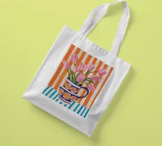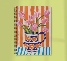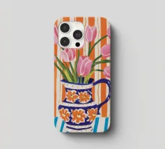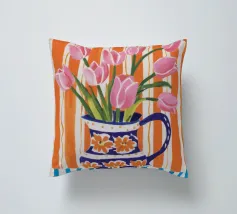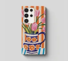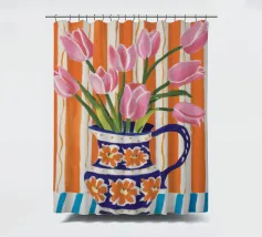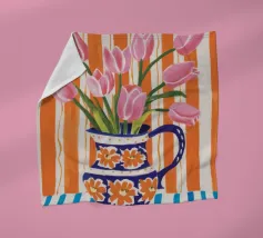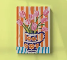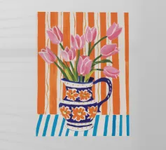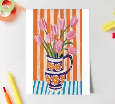 Un bellissimo bouquet di tulipani rosa in una classica tazza o brocca a righe bianche e blu. La composizione è fresca, affascinante e ha una semplicità senza tempo, in stile costiero o country.