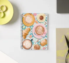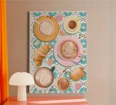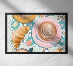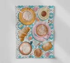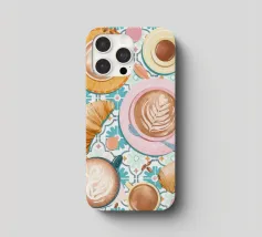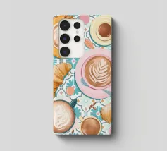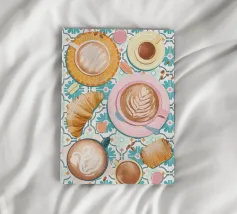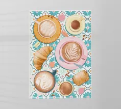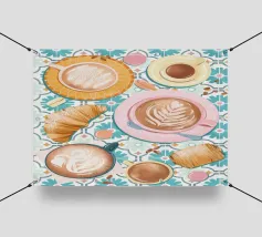 tazze da caffè latte art piattini croissant macarons espresso cappuccino moka latte motivo a piastrelle cucchiaio bevanda pasticcini tavolo per la colazione zucchero schiuma d'arte posa piana colazione pane chicchi di caffè rovesciati