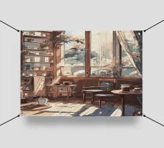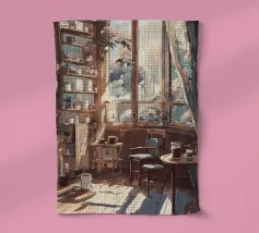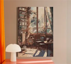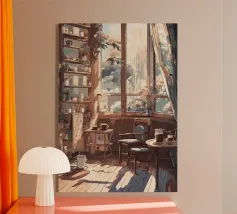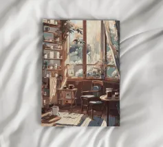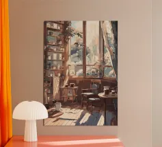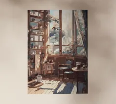 tazze da caffè sedie pavimenti in legno finestre luce del sole librerie piante tende tavolino libri cornici vasi di vetro piante in vaso stanza accogliente raggi di sole design d'interni oggetti decorativi tavolino da caffè colori caldi ombre