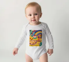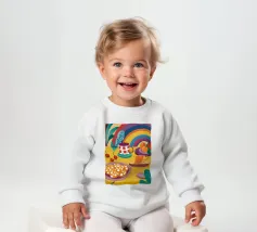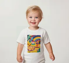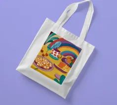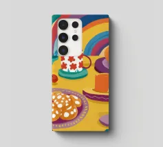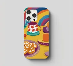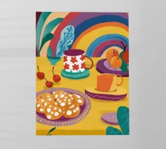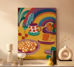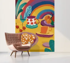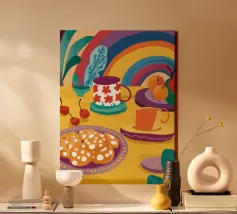 Una magica scena di tea party è immersa nella luce di un vibrante arcobaleno, con tè e biscotti disposti su un tavolo, creando un momento di pura gioia, meraviglia e allegria.