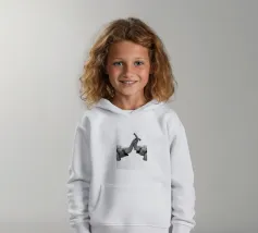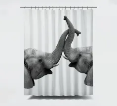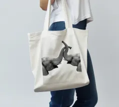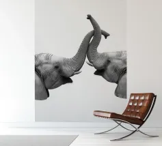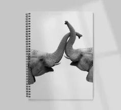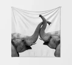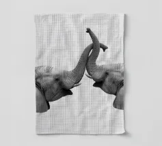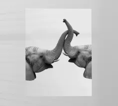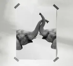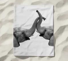 Questa illustrazione minimalista mostra due elefanti in un abbraccio affettuoso, con le proboscidi delicatamente intrecciate. In bianco e nero, il disegno esprime il legame e l'affetto tra gli animali, perfetto per gli amanti degli animali.