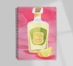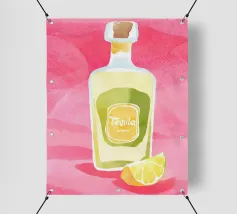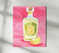 Sfondo rosa con tequila in bottiglia gialla e limone. Generato con AI (Canva).