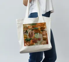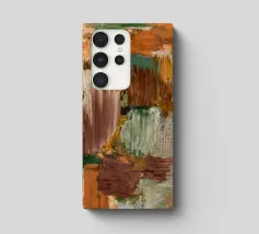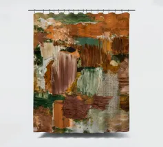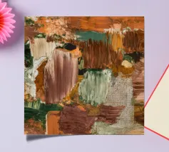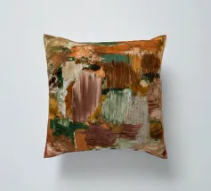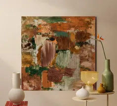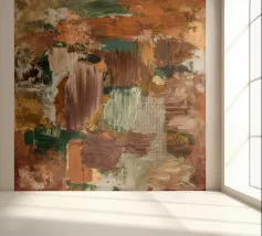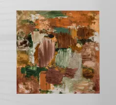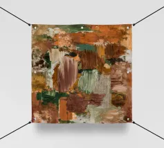 Una composizione astratta con macchie di terracotta, arancione, marrone e verde tenue, che suggerisce una veduta aerea di campi coltivati o un paesaggio terroso fortemente strutturato. Stile Bob Nugent.