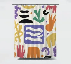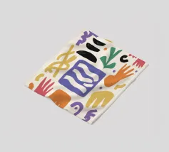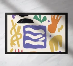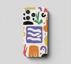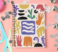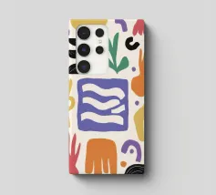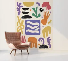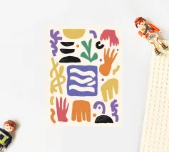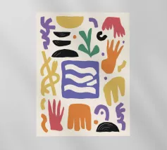 Una composizione astratta e minimalista di varie forme organiche e geometriche in una disposizione equilibrata, utilizzando una tavolozza tenue e terrosa di terracotta, nero e beige.