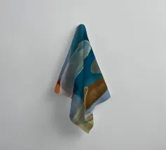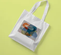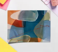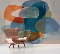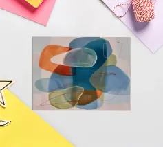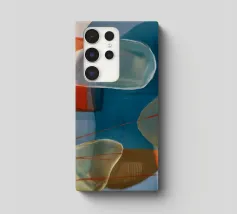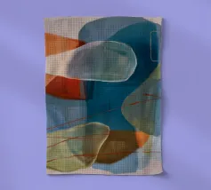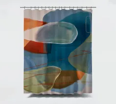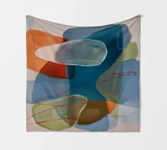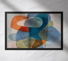 Una serena composizione astratta con forme sovrapposte e arrotondate simili a ciottoli in un'armoniosa tavolozza di blu, terracotta, verde e beige, con texture sottili.