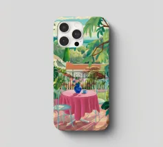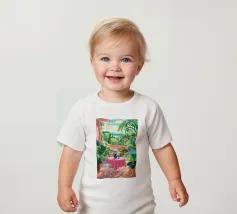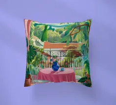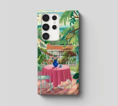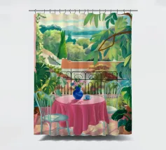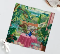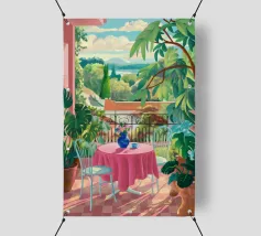 Una bella scena di una tavola imbandita per un pasto su una terrazza, circondata da un giardino verdeggiante e inondato di sole. L'immagine evoca una sensazione di sogno, idilliaca e tranquilla esperienza culinaria all'aperto.