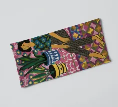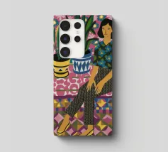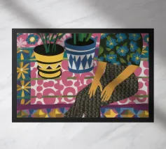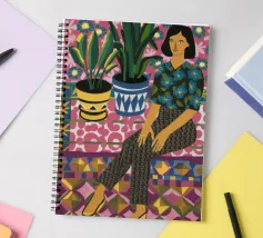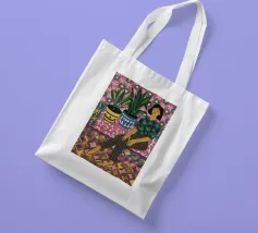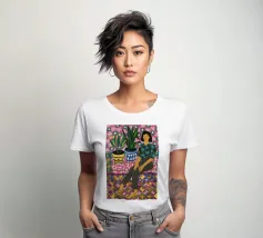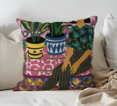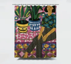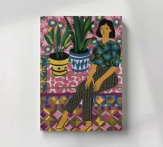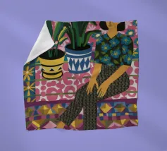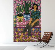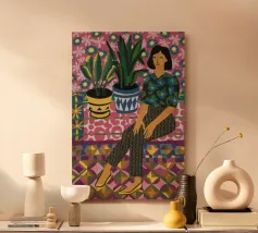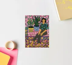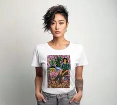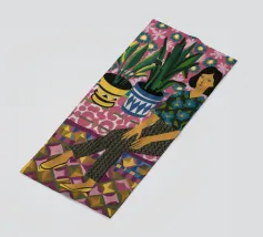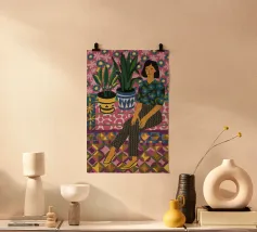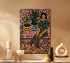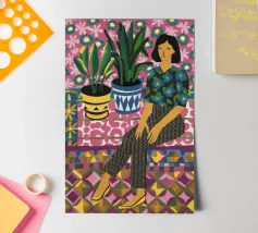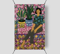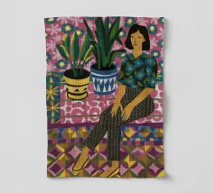 Illustrazione di una donna con un abito a fantasia seduta su una terrazza, forse intenta a tessere o a lavorare, circondata da piante in vaso, con un tappeto o un arazzo colorato a motivi geometrici.