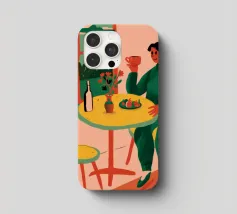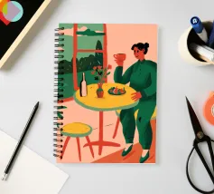 Una donna in abito verde degusta un bicchiere di vino a un tavolino su una terrazza al tramonto, circondata da piante e con la vista di una luna crescente.
