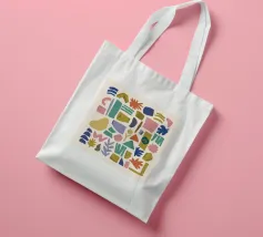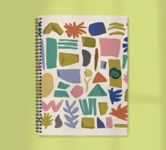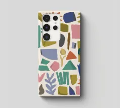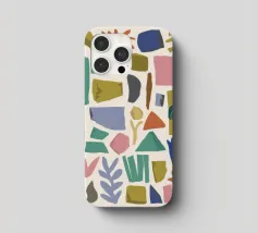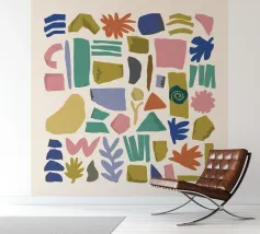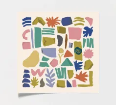 Un motivo giocoso di forme astratte e sparse in una tavolozza di colori pastello che ricorda un moderno pavimento a terrazzo.
