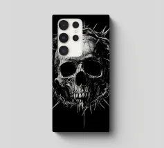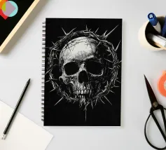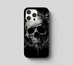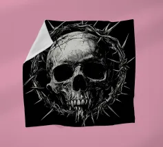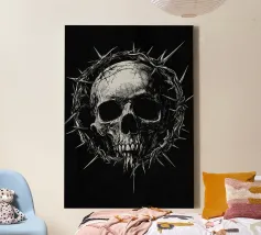 Un teschio disegnato in modo realistico è circondato da una minacciosa corona di spine. Crepe e ombre conferiscono una profondità cupa. Lo sfondo nero enfatizza il simbolismo morboso. L'immagine gioca con il simbolismo religioso e oscuro e crea un effetto emotivo intenso.