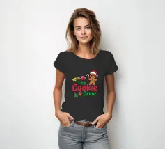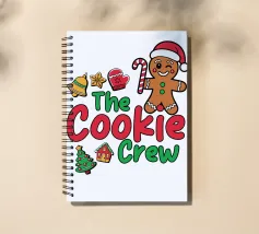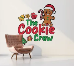 Un allegro disegno a tema natalizio presenta un omino di pan di zenzero con un cappello da Babbo Natale, circondato da icone festive come bastoncini di zucchero, alberi di Natale e campanelle. Il testo in grassetto "The Cookie Crew" cattura il giocoso spirito natalizio.