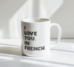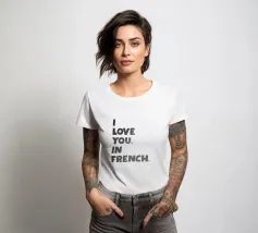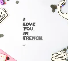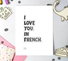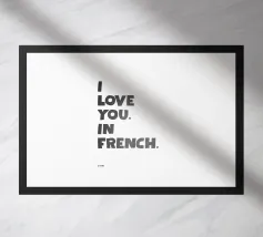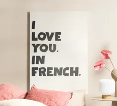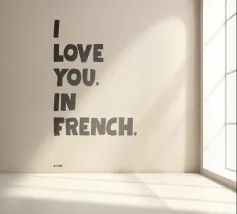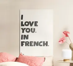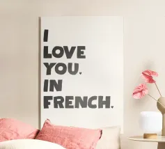Una dichiarazione d'amore dolce ed elegante, questa opera d'arte minimalista unisce una tipografia giocosa a un tocco romantico. Con la frase in grassetto "I Love You. In francese", seguita dalla delicata frase "je t'aime", questo disegno è perfetto per interni moderni, note d'amore o per chiunque conosca la lingua degli affetti.