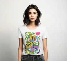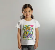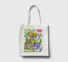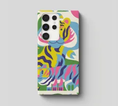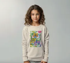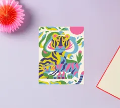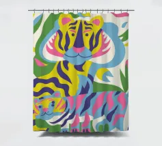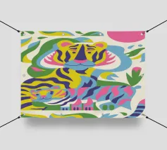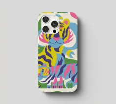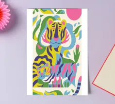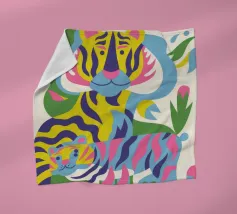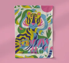 Questa immagine raffigura una tigre colorata e stilizzata con strisce vivaci nei toni del blu, del giallo e del rosa. Lo sfondo è pieno di forme e motivi astratti, che rendono l'illustrazione vivace e dinamica.