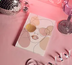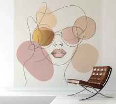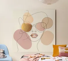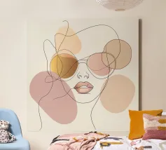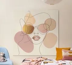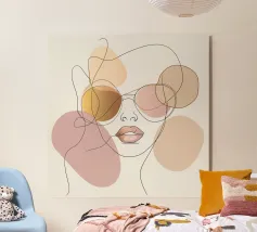 Un tocco di sicurezza giocosa e di chic moderno. Questa illustrazione artistica a una linea cattura una donna elegante con un sottile ammiccamento, vista attraverso occhiali da sole colorati di rosa. I blocchi di colore astratti in rosa blush e oro caldo aggiungono un tocco morbido e contemporaneo. Un pezzo perfetto per portare un'energia leggera e alla moda nel vostro spazio.