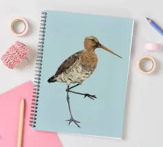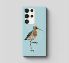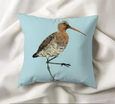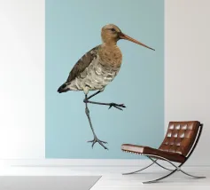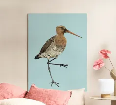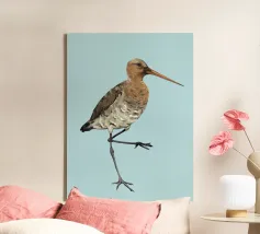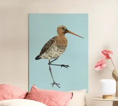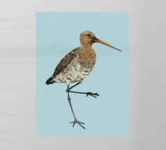 Un'illustrazione digitale ritrae una dea bendata che si regge su una zampa. L'uccello ha un lungo becco arancione, un piumaggio marrone e grigio e piume della coda nere. Le sue lunghe e sottili zampe sono grigie e una è estesa in avanti, mentre l'altra è piegata al ginocchio.