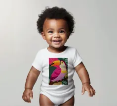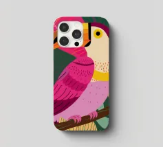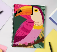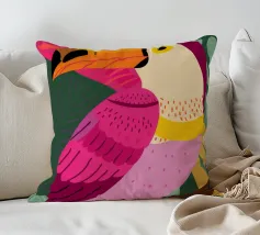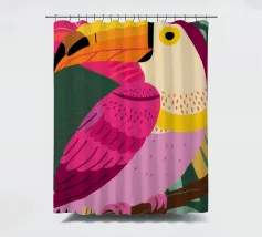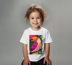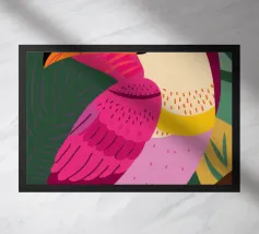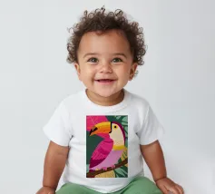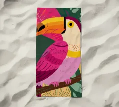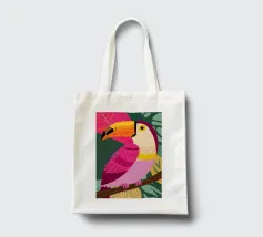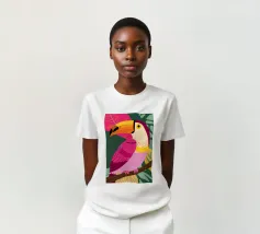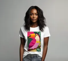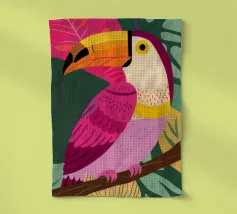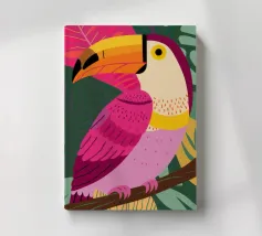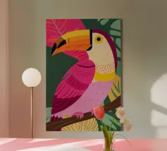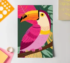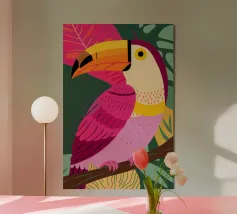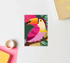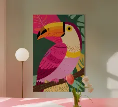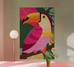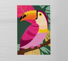Una vivace illustrazione di due tucani dal becco colorato appollaiati su un ramo in mezzo a un rigoglioso fogliame tropicale, resa in uno stile grafico e audace.