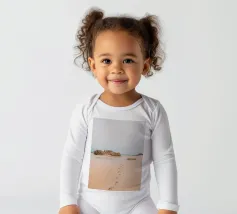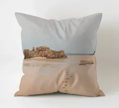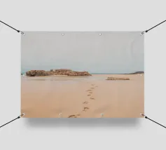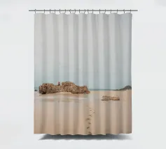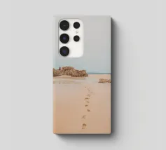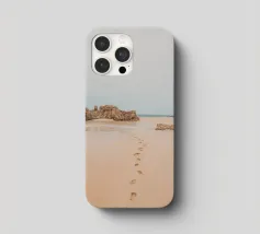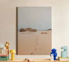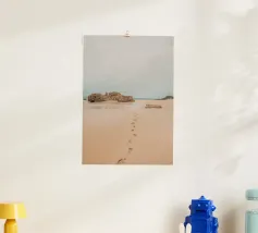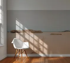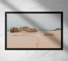 Foto minimalista di spiaggia con impronte di piedi nella sabbia che conducono a una costa rocciosa in riva al mare. Questa scena calma e meditativa invita a sognare e simboleggia la solitudine, la libertà e il viaggio verso se stessi. Ideale come murale per gli amanti della natura, della tranquillità e dell'estetica chiara. Perfetto per camere da letto, uffici o stanze meditative - un motivo per fare un respiro profondo.