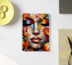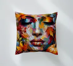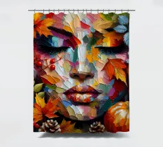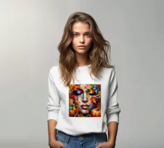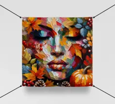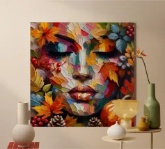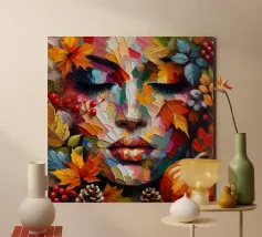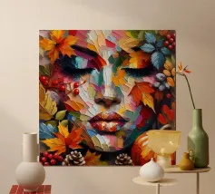 Pittura acrilica del volto di una donna durante la stagione autunnale. Foglie, zucca, ghiande e bacche.