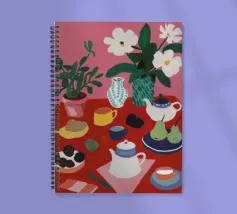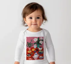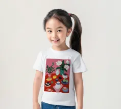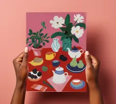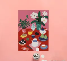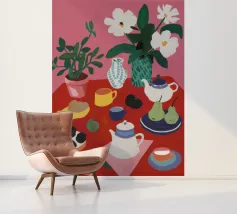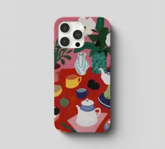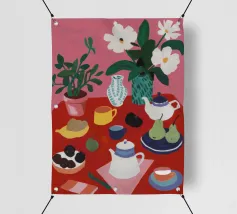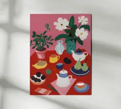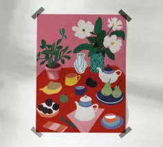 Un'affascinante natura morta di un servizio da tè con tazze delicate, teiera, dolcetti e fiori bianchi, disposti su un tavolo, che evoca un senso di calma ed eleganza tradizionale.