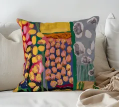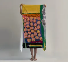 Sezioni di motivi e colori diversi, rossi, gialli, blu, bianchi e grigi, formano una composizione simile a una trapunta, creando un campo astratto tattile e visivamente diverso.